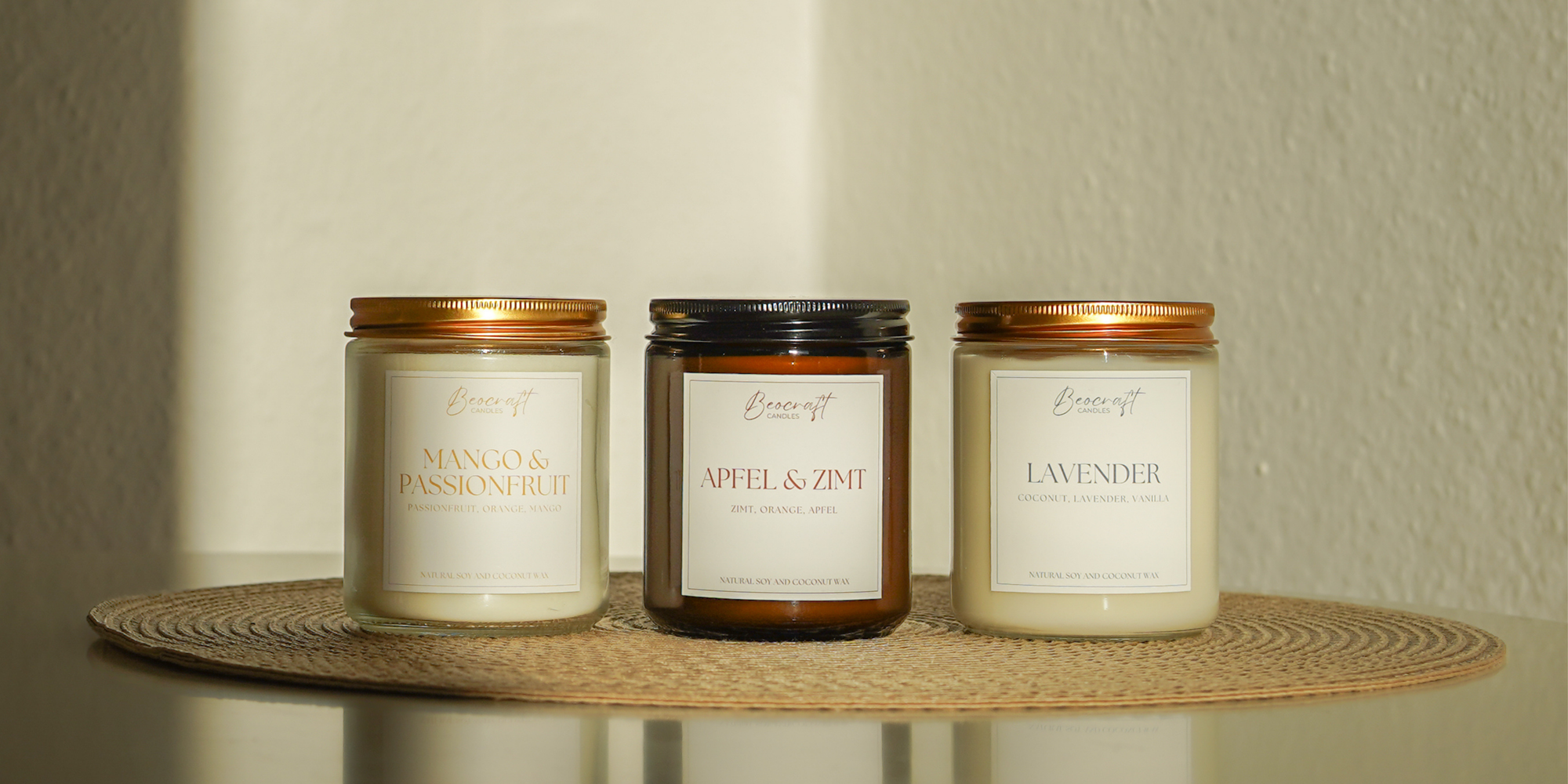 Bei Beocraft wird jede Kerze mit großer Sorgfalt von Hand gegossen. Wir verwenden ausschließlich 100% reines Kokosnuswachs aus Deutschland, frei von Paraffin und künstlichen Zusatzstoffen.